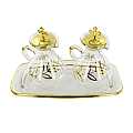 Coppia di ampolline in vetro soffiato con decoro dorato con capienza 100 cc, con piatto in vetro bordato d'oro. È possibile anche acquistare ampolle e vassoio separatamente. Realizzato in Italia.