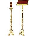 Leggio a colonna in metallo dorato in stile barocco.L'altezza massima è di 156 cm mentre quella minima è di 136 cm.Il piano di appoggio per il libro misura in larghezza 40,5 cm e in profondità 30 cm.Disponibile, su richiesta, anche con finitura nikelata; in questo caso i tempi di consegna saranno da valutare chiamando lo 039 321956.