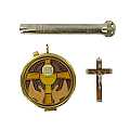 Borsellino in camoscio grigio 9x12x3 cm con teca e crocetta per Comunione.