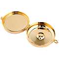 Teca in metallo dorato con placca in peltro, modello agnello. Diametro 4 cm. Realizzata in Italia.