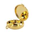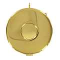 Teca in metallo dorato con placca in peltro, modello calice. Diametro 4 cm. Realizzata in Italia.