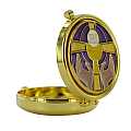 Teca eucaristica in metallo dorato, all'interno come all'esterno, con decorazioni di simboli eucaristici, mani in offerta e la croce, dipinti a smalto sul coperchio.Completa di anello per portarla al collo.Altezza: 1,5 cm Diametro interno: 5 cm Capacità: 7 ostie Realizzato in Italia