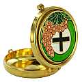 Teca eucaristica in metallo dorato, all'interno come all'esterno, con decorazioni sul coperchio di simboli eucaristici uva, ostia e croce, colorati e smaltati.E' completa di anello per portarla al collo.Altezza: 1,5 cm Diametro interno: 5 cm Capacità: 7 ostie Peso totale con scatola gr. 94 senza scatola gr. 67Realizzato in Italia