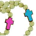 Il braccialetto in legno chiaro con 20 grani del diamento 7, un grano ovale più grande ed una crocietta in ulivo di cm 1,9 di colore verde, azzurro e fucsia.Materiale: legnoRealizzato in Italia.