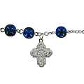 Braccialetto con palline in vetro maculato di diametro 8 mm di colore blu e croce di altezza 2 cm.La Croce, in metallo ossidato, raffigura in entrambe le facce la Madonna Miracolosa, Sacro Cuore di Gesù, San Cristoforo, San Giuseppe con al centro la Cololmba, simbolo di pace e cristianità.La circonferenza del bracciale è 21 cm e il peso è 10 gr.Il prodotto è stato realizzato in Italia da artigiani i quali hanno prestato particolare attenzione e cura ai dettagli.MADE IN ITALY