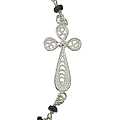 Bracciale con zirconi neri sfaccettati e legatura a girello con filo in argento 925% rodiato,che gli conferisce una particolare robustezza ed eleganza.L'eleganza di questo bracciale,disponibile anche con grani in giada o in ametista,è data dalla croce in filigrana,anch'essa in argento 925%,finemente lavorata a mano da artigiani italiani.La misura del braccialeè di 18,5 cm e può essre aumentata grazie ad una catenina,a maglia larga,lunga circa cm 2,5.Peso del bracciale:3,5 gr.Della stessa linea è disponibile anche la collana (articolo 0221cone)