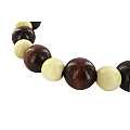 Braccialetto elastico con grani lucidi in legno a due colori alternati (marrone scuro e creme/beige). Include anche una croce Tau che non è inserita come pendente, ma aderisce al polso. Grazie all'elastico, è comodo vestire il bracciale, che si adatta anche a diverse dimensioni di polso. Considerate che la circonferenza del braccialetto con elastico non tirato è di 19 cm.Fatto in Italia.