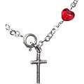 Braccialetto con 11 grani a forma di piccoli cuoricini di 0,5 cm in vetro rosso.All'estremità è posta una piccola di croce di altezza 1,5 cm.Il prodotto è stato realizzato in Italia da artigiani prestando particolare attenzione e cura ai dettagli.Ideale come regalo.Peso: 2,5 gr. Materiale: metallo e vetro