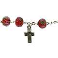 Braccialetto rosario con grani di diametro 7 mm in vetro sfaccettato di colore rosso con fiori di colore rosa. Accanto al pater è posta una piccola croce liscia di misura 1,5 cm.La circonferenza del bracciale è 18,5 cm. Il prodotto è stato realizzato in Italia da artigiani i quali hanno prestanto particolare attenzione e cura ai dettagli.Materiale: vetro Peso: 13 gr.MADE IN ITALY