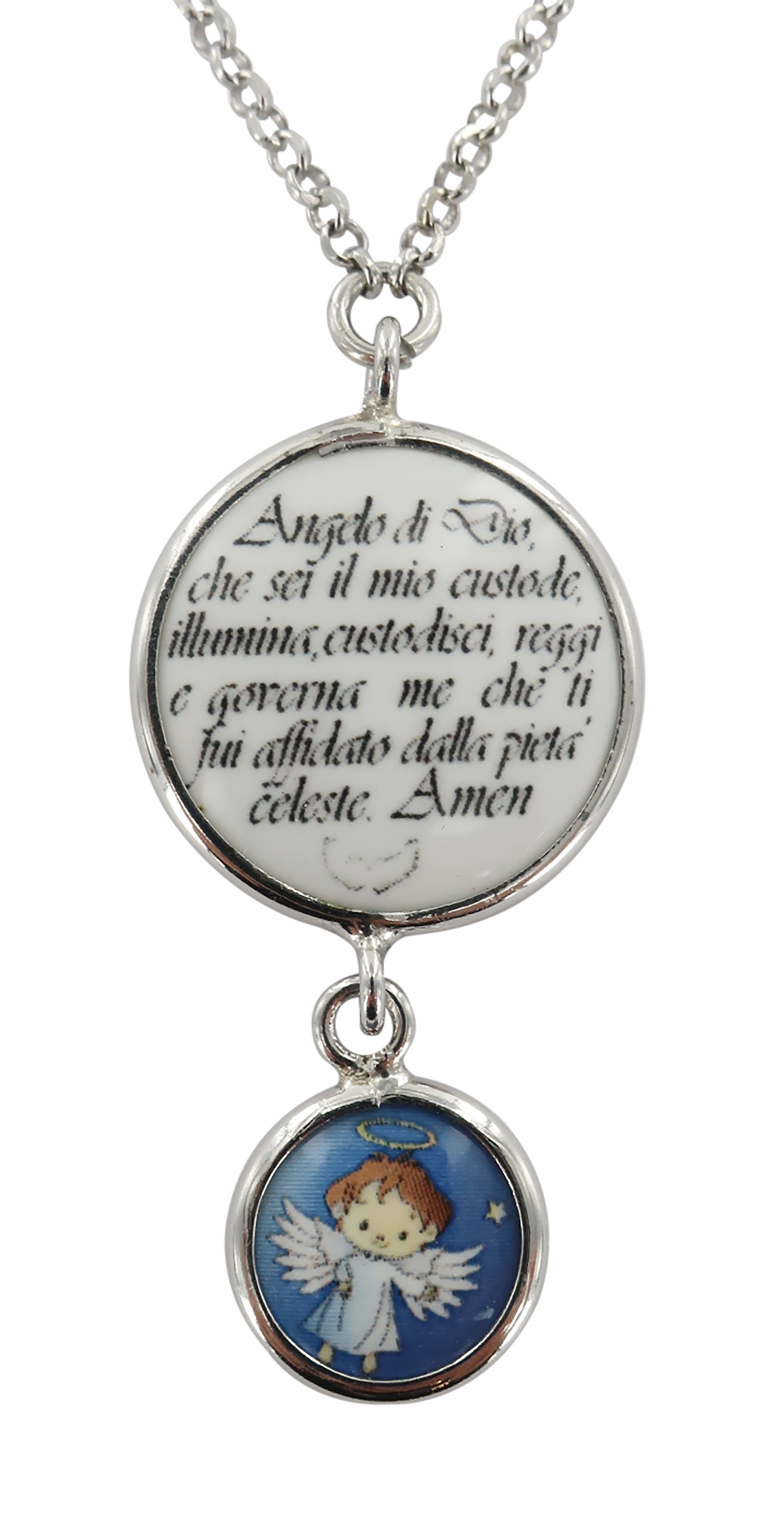 Collana in argento 925% con due medaglie pendenti una con stampata la preghiera dell'angelo di Dio e l'altra con un piccolo angioletto stampato su porcellana blù,queste medaglie in porcellana sono incastonate in un profilo di argento lucido.La collana con chiusura a moschettone ha una circonferenza di 40 cm,misura che può essere aumentata grazie all'aggiunta di una catenella a maglia larga di circa 3 cm di lunghezza.Una medaglia misura cm 1,5 e l'altra misura cm 0,8 cm.Il peso della collana è di 5,2 gr Il tutto è realizzato da un azienda italiana in esclusiva per la ditta che la presenta e verrà consegnata in una confezione molto pregiata.