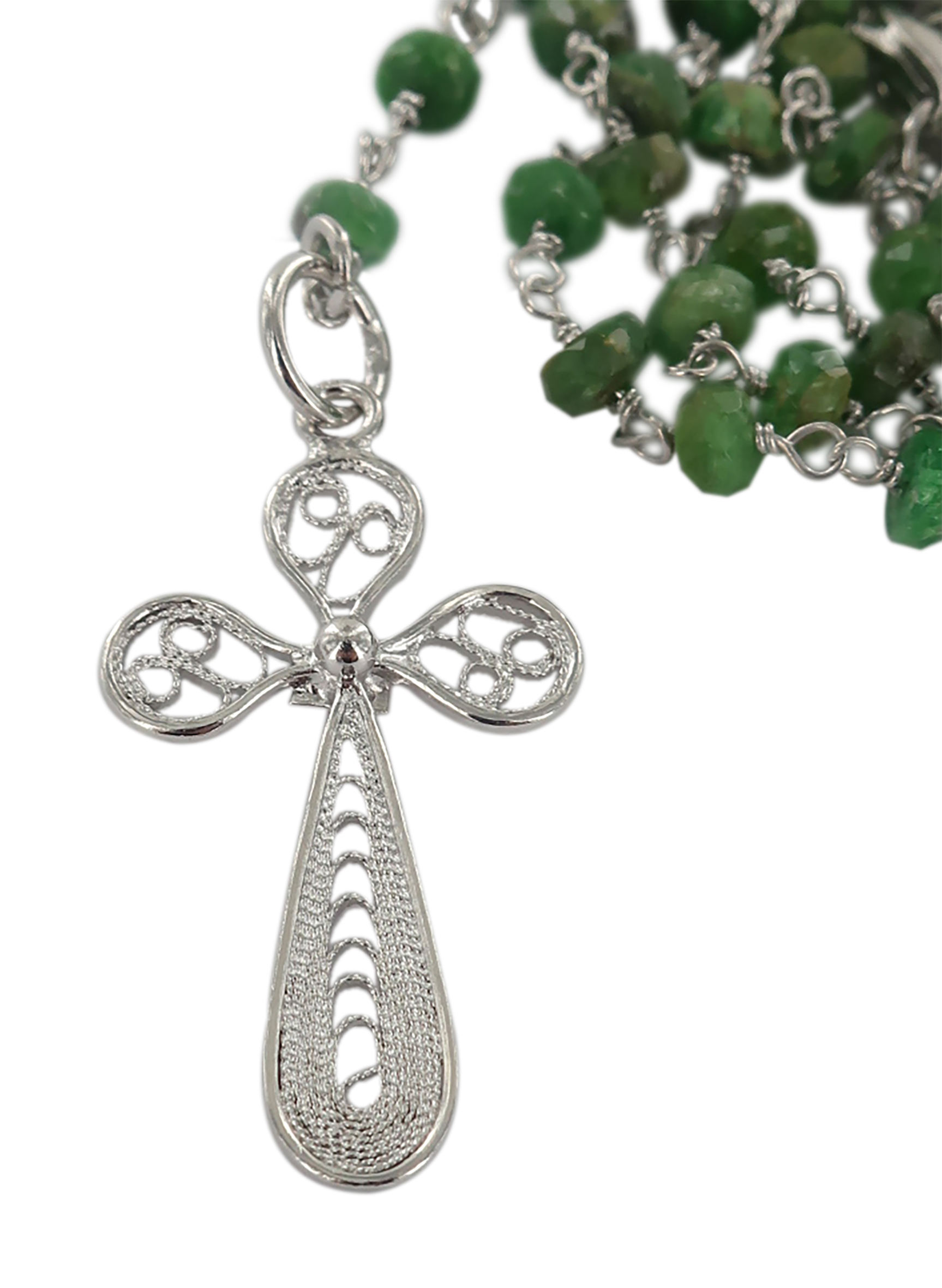 La collana con grani in giada ha la legatura a mano a girello con filo in argento 925% rodiato,che conferisce alla collana stessa una particolare robustezza ed eleganza.La particolarità di questo articolo,che è disponibile anche con grani in ametista o con zirconi neri,è dato dalla croce e dalla crocera in filigrana finemente lavorata a mano da artigiani italiani.Della stessa linea è disponibile anche il bracciale (articolo 0023BRGI).Il peso della collana è di grammi 7,3 gr.