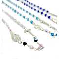 Il rosario si presenta con i 59 grani del Santo Rosario ma, fatto a forma di collana. Sul davanti vi è una piccola croce di mm 20 ed una medaglietta rappresentante la Madonna Miracolosa, un moschettone sul retro ci permetterà di infilare l'articolo al collo. Il tutto rilegato a mano con filo di metallo argentato. Sono venduti in confezione a 12 pezzi di colori misti.La lunghezza del rosario è di cm 24,5 la circonferenza è di cm 49Peso: 5 gr.Realizzato in Italia.