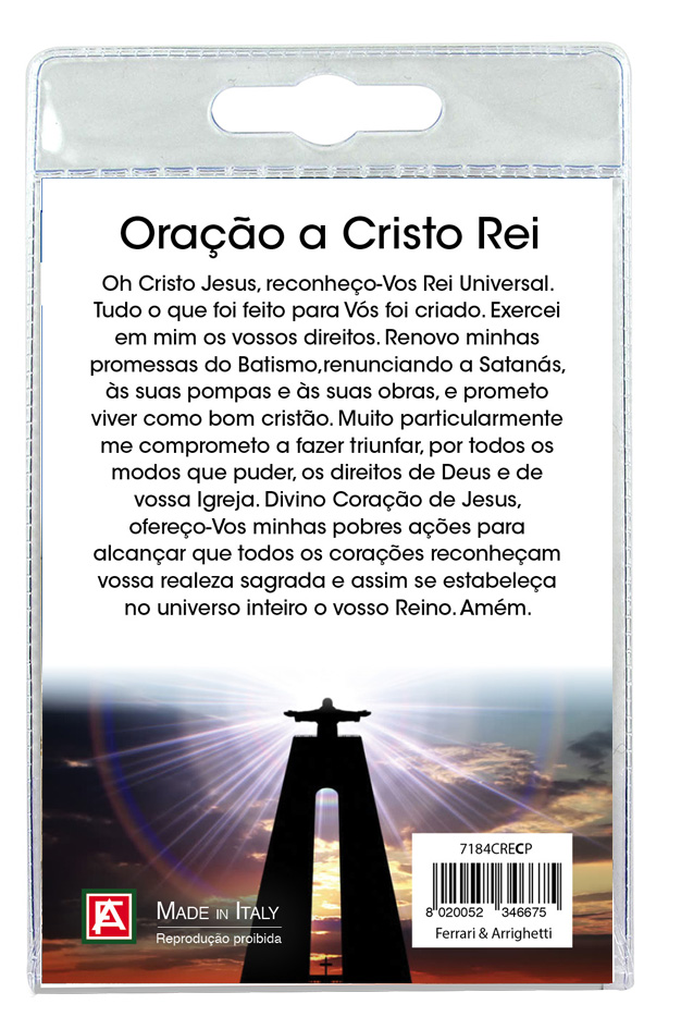 Il blister si presenta con un cartoncino che ha l'immagine dell'esterno del Santuario del Cristo Rei.Sul retro del cartoncino è stampata una preghiera scritta in portoghese a lui dedicata e la croce interna di cm 4,8 è in metallo lavorato con smalto rosso e il Cristo riportortato in metallo argentato.Realizzato in Italia.