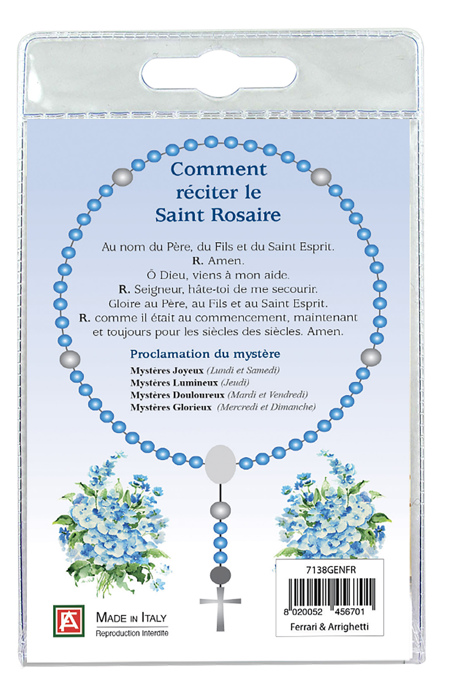 Il blister si presenta con all'interno un cartoncino, rappresentante l'immagine di Santa Genoveffa ed una decina con grani tondi in legno di mm 4 che, con gancetto si può applicare come ciondolo.Sul retro del cartoncino è spiegato come si recita il rosario.Realizzato in Italia.