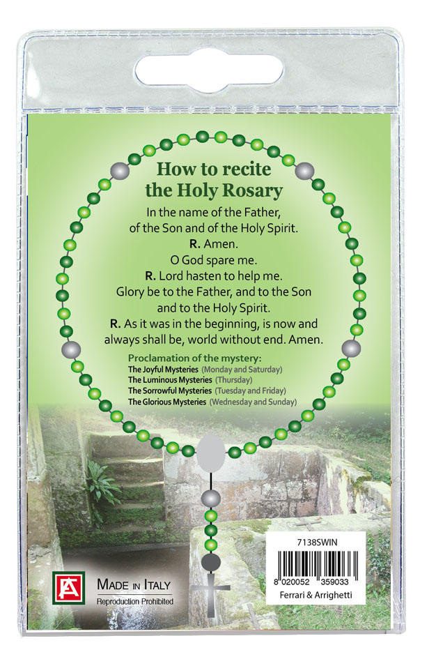 Il blister si presenta con all'interno un cartoncino, rappresentante la foto dell'apparizione di Santa Winefride ed una decina con grani tondi in legno di mm 4 che, con gancetto si può applicare come ciondolo.Sul retro del cartoncino è spiegato come si recita il rosario.Realizzato in Italia.
