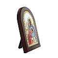 Icona Sacra Famiglia a forma di arco con lastra in argento e decori in oro, da 10 x 14 cm. L'icona è inserita in un quadro ad arco di legno color mogano. Il quadro può essere sia appeso che appoggiato grazie al foro sul retro e ad un piedino d'appoggio presente all'interno della confezione. Verrà consegnato in una scatola con interno vellutato.Il peso è di gr 247 circa. Dimensioni: 10 x 14 x 1,5 cm. Prodotto in Grecia.