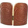 Dittico greco in legno dalle tonalità calde rossastre, con retro intagliato e cerniera metallica. Le raffigurazioni sui due pannelli, che ricordano lo stile delle icone, rappresentano Cristo Pantocratore e la Madre di Dio della tenerezza di Vladimir. Le immagini sono una litografia a colori su carta lucida applicata su legno. Particolarità di questo prodotto, in confronto agli altri della medesima linea prodotta in Grecia, è lo sfondo color oro, lucido e riflettente, che dona luminosità alle figure e attribuisce a questo dittico un aspetto pregiato. Dalla forma arrotondata nella parte superiore, questo dittico può essere un'idea regalo per occasioni come cresime, comunioni, matrimoni, anniversari, ecc. A seconda della disponibilità, il motivo floreale dell'intaglio esterno e le immagini all'interno del dittico potrebbero differire rispetto a quanto indicato in foto. Misure del dittico aperto: Altezza 7 cm / Larghezza 10 cm. Realizzato in Grecia.