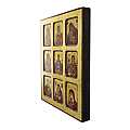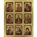 Questa icona da parete di legno presenta 9 immagini che raffigurano la Madonna, quasi sempre insieme al Bambino. Si tratta di un quadretto che si sviluppa in altezza, che ospita 3 file di immagini rettangolari da 3 raffigurazioni mariane ognuna. Sono delle icone appartenenti a vari gruppi: c'è la Madonna Eleousa (della Tenerezza), la Vergine di tipo ieratico dell'Odigitria e al centro troviamo la Madonna Orante (intercedente), con le mani alzate aperte e i palmi rivolti verso i fedeli, insieme al Bambino che compare nella coppa, simbolo del sacrificio divino per l'Umanità. L'unica rappresentazione in cui la Madonna non è con il Bambino è quella della Santissima Theotokos "Semistrelnaya" (chiamata anche "L’addolcimento del cuore malvagio" o "La profezia di Simeone"), il cui cuore è trafitto da 7 spade. Il quadretto-icona è realizzato con litografie su carta incollate ad una tavola lignea, rifinite con scritte, aureole e bordi bordeaux tracciati a mano. Lo sfondo è abbellito da una rifinitura in foglia d'oro che renderà questa tavoletta illustrata alta 24,5 cm ancora più bella e lucente. Un leggero effetto dona un aspetto anticato all'icona. Le varie immagini vengono esaltate dallo spessa smussatura bordeaux che fa da contorno ai vari riquadri incassati in cui le figure trovano posto. Anche grazie a questa accortezza grafica, la grande icona appare come un'opera multi-soggetto. Grazie al gancio posteriore, questo quadretto può essere facilmente appeso al muro. Un certificato sul retro attesta le caratteristiche pregiate e il processo di realizzazione di questa opera artigianale. Altezza: 25 cm, larghezza: 20 cm, spessore: 2,5 cm. Peso: 513 kg. Realizzata in Grecia.