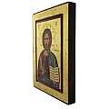 Icona da parete, di forma rettangolare, che raffigura Gesù Pantocratore. Si tratta di una copia d'arte bizantina: l'immagine di Cristo con il libro aperto e la mano benedicente è una fine litografia incollata su legno e rifinita con foglia d'oro, mentre le aureole, le scritte e i bordi sono realizzati a mano. Il contorno interno, incassato, divide la rappresentazione centrale dal bordo, che diventa una cornice. Il gancio sul retro consente di appendere l'icona al muro. Il Cristo Pantocratore è a mezzo busto, con il manto blu scuro e tre dita della mano destra levate nell'atto di benedire l'umanità secondo lo stile bizantino, mentre con la sinistra tiene il libro. Tale icona ha una forte valenza simbolica: Gesù ha il libro aperto ed è pronto a divulgare il "Verbo". Il suo atteggiamento è severo e maestoso, ma anche amorevole e compassionevole con chiunque lo voglia udire. Lo sfondo, di color oro brillante, dona ulteriore risalto ai soggetti della rappresentazione. Il certificato sul retro attesta le caratteristiche di questa icona, realizzata in Grecia. Dimensioni: 18,5 cm (L), 23,5 cm (A), 2,5 cm (P). Peso: 563 gr.