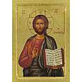 Icona da parete, di forma rettangolare, che raffigura Gesù Pantocratore. Si tratta di una copia d'arte bizantina: l'immagine di Cristo con il libro aperto e la mano benedicente è una fine litografia incollata su legno e rifinita con foglia d'oro, mentre le aureole, le scritte e i bordi sono realizzati a mano. Il bordo del quadretto, in rilievo con smussatura, funge da cornice alla rappresentazione. Il gancio sul retro consente di appendere l'icona al muro. Il Cristo Pantocratore è a mezzo busto, con il manto blu scuro e tre dita della mano destra levate nell'atto di benedire l'umanità secondo lo stile bizantino, mentre con la sinistra tiene il libro. Tale icona ha una forte valenza simbolica: Gesù ha il libro aperto ed è pronto a divulgare il "Verbo". Il suo atteggiamento è severo e maestoso, ma anche amorevole e compassionevole con chiunque lo voglia udire. Lo sfondo, di color oro brillante, dona ulteriore risalto ai soggetti della rappresentazione. Il certificato sul retro attesta le caratteristiche di questa icona, realizzata in Grecia. Dimensioni: 18,8 cm (L), 25,7 cm (A), 2,4 cm (P). Peso: 435 gr.