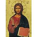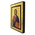 Icona da parete, di forma rettangolare, che raffigura Gesù Pantocratore. Si tratta di una copia d'arte: l'immagine di Cristo con il libro aperto e la mano benedicente è una fine litografia incollata su legno e rifinita con foglia d'oro, mentre le aureole, le scritte (come il cristogramma IC XC) e i bordi sono realizzati a mano. Si tratta di una riproduzione dell'icona su tavola di Lia Galdiolo (iconografa italiana); i colori risultano più accesi rispetto ai classici toni, di intensità un po' più lieve, dell'arte bizantina. Il contorno interno, incassato, divide la rappresentazione centrale dal bordo, che diventa una cornice. Il gancio sul retro consente di appendere l'icona al muro. Il Cristo Pantocratore è a mezzo busto, con il manto blu e tre dita della mano destra levate nell'atto di benedire l'umanità secondo lo stile ortodosso, mentre con la sinistra tiene il libro. Tale icona ha una forte valenza simbolica: Gesù ha il libro aperto ed è pronto a divulgare il "Verbo". Il suo atteggiamento è severo e maestoso, ma anche amorevole e compassionevole con chiunque lo voglia udire. Lo sfondo, di color oro brillante, dona ulteriore risalto ai soggetti della rappresentazione. Il certificato sul retro attesta le caratteristiche di questa icona, realizzata in Grecia. Dimensioni: 19 cm (L), 25 cm (A), 2,3 cm (P). Peso: 595 gr.