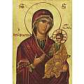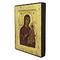 Icona da parete, di forma rettangolare, che raffigura la Vergine con Bambino in braccio. Si tratta di una copia d'arte bizantina: l'immagine è una fine litografia, incollata su legno e rifinita con foglia d'oro, mentre le aureole, le scritte e i bordi sono realizzati a mano. Il bordo del quadretto, in rilievo con smussatura, funge da cornice alla rappresentazione. Il gancio sul retro consente di appendere l'icona al muro. La Madonna col Bambino indossa un indumento rosso scuro e i volti dei soggetti presentano sfumature molto fini e curate. Anche la resa dei ricci del Gesù Bambino denota un'attenzione ai dettagli molto alta. Il figlio, in vesti gialle, ha le dita della mano destra piegate in segno benedicente, come vuole la tradizione bizantina. Lo sfondo, di color oro brillante, dona ulteriore risalto ai soggetti della rappresentazione. Il certificato sul retro attesta le caratteristiche di questa icona, realizzata in Grecia. Dimensioni: 14 cm (L), 18 cm (A), 2 cm (P). Peso: 225 gr.