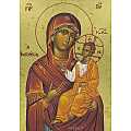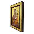 Icona da parete, di forma rettangolare, che raffigura la Vergine con Bambino in braccio. Si tratta di una copia d'arte bizantina: l'immagine è una fine litografia, incollata su legno e rifinita con foglia d'oro, mentre le aureole, le scritte e i bordi sono realizzati a mano. Grazie al bordo interno incassato di colore bordeaux, che dona ulteriore risalto ai soggetti, quello esterno spicca, fungendo da cornice alla rappresentazione. Il gancio sul retro consente di appendere l'icona al muro. La Madonna col Bambino indossa un mantello rosso e i volti dei soggetti presentano sfumature molto fini e curate. Anche la resa dei ricci del Gesù Bambino denota un'attenzione ai dettagli molto alta. Il figlio, in vesti bianche, gialle e arancioni, ha le dita della mano destra piegate in segno benedicente, come vuole la tradizione bizantina. Lo sfondo, di color oro brillante, dona ulteriore risalto ai soggetti della rappresentazione. Il certificato sul retro attesta le caratteristiche di questa icona, realizzata in Grecia. Dimensioni: 19,5 cm (L), 25,2 cm (A), 2,3 cm (P). Peso: 609 gr.