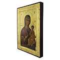 Grande icona da parete, di forma rettangolare, che raffigura la Vergine con Bambino in braccio. Si tratta di una copia d'arte bizantina: l'immagine è una fine litografia, incollata su legno e rifinita con foglia d'oro, mentre le aureole, le scritte e i bordi sono realizzati a mano. Il bordo del quadretto, in rilievo con smussatura, funge da cornice alla rappresentazione. Il gancio sul retro consente di appendere l'icona al muro. La Madonna col Bambino indossa un indumento rosso scuro e i volti dei soggetti presentano sfumature molto fini e curate. Anche la resa dei ricci del Gesù Bambino denota un'attenzione ai dettagli molto alta. Il figlio, in vesti gialle, ha le dita della mano destra piegate in segno benedicente, come vuole la tradizione bizantina. Lo sfondo, di color oro brillante, dona ulteriore risalto ai soggetti della rappresentazione. Il certificato sul retro attesta le caratteristiche di questa icona di grandi dimensioni, realizzata in Grecia. Dimensioni: 24 cm (L), 31,5 cm (A), 2,6 cm (P). Peso: 866 gr.