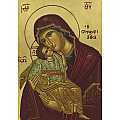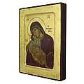 Icona da parete, di forma rettangolare, che raffigura la Vergine della Tenerezza di Vladimir. Si tratta di una copia d'arte bizantina: l'icona originale della Madre di Dio della Tenerezza, a cui questa riproduzione si ispira, fu dipinta a Costantinopoli nel XII secolo ed è conservata a Mosca. Tra le icone ortodosse più venerate al mondo, la Theotókos ("Madre di Dio" in greco) è la figura protettrice della Russia. L'immagine è una fine litografia di una Madonna con Bambino, incollata su legno e rifinita con foglia d'oro, mentre le aureole, le scritte e i bordi sono realizzati a mano. Il bordo del quadretto è in rilievo con smussatura. Il gancio sul retro consente di appendere l'icona al muro. La Madonna di Vladimir indossa un velo rosso scuro e i volti dei soggetti presentano sfumature molto fini e curate. Anche la resa dei ricci del Gesù Bambino denota un'attenzione ai dettagli molto alta. Il figlio abbraccia la madre e i volti sono accostati; tale rappresentazione, classico esempio di iconografia bizantina della tipologia eleusa, crea un'immagine molto dolce. Lo sfondo, di color oro brillante, dona ulteriore risalto ai soggetti della rappresentazione. Il certificato sul retro attesta le caratteristiche di questa icona, realizzata in Grecia.