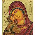 Icona da parete, di forma rettangolare, che raffigura la Vergine della Tenerezza di Vladimir. Si tratta di una copia d'arte bizantina: l'icona originale della Madre di Dio della Tenerezza, a cui questa riproduzione si ispira, fu dipinta a Costantinopoli nel XII secolo ed è conservata a Mosca. Tra le icone ortodosse più venerate al mondo, la Theotókos ("Madre di Dio" in greco) è la figura protettrice della Russia. L'immagine è una fine litografia di una Madonna con Bambino, incollata su legno e rifinita con foglia d'oro, mentre le aureole, le scritte e i bordi sono realizzati a mano. Il bordo del quadretto è in rilievo con smussatura. Il gancio sul retro consente di appendere l'icona al muro. La Madonna di Vladimir indossa un velo rosso scuro e i volti dei soggetti presentano sfumature molto fini e curate. Anche la resa dei ricci del Gesù Bambino denota un'attenzione ai dettagli molto alta. Il figlio abbraccia la madre e i volti sono accostati; tale rappresentazione, classico esempio di iconografia bizantina della tipologia eleusa, crea un'immagine molto dolce. Lo sfondo, di color oro brillante, dona ulteriore risalto ai soggetti della rappresentazione. Il certificato sul retro attesta le caratteristiche di questa icona, realizzata in Grecia.