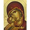 Icona da parete, di forma rettangolare, che raffigura la Vergine della Tenerezza di Vladimir (altrimenti detta "Theotókos di Vladimir"). Si tratta di una copia d'arte bizantina: l'icona originale della Madre di Dio della Tenerezza, a cui questa riproduzione si ispira, fu dipinta a Costantinopoli nel XII secolo ed è conservata a Mosca. Tra le icone ortodosse più venerate al mondo, la Theotókos ("Madre di Dio" in greco) è la figura protettrice della Russia. L'immagine è una fine litografia incollata su legno e rifinita con foglia d'oro, mentre le aureole, le scritte e i bordi sono realizzati a mano. Il bordo, volutamente smussato in modo irregolare, dona all'icona un aspetto rustico e artigianale. Il gancio sul retro consente di appendere l'icona al muro. La Madonna di Vladimir indossa un velo rosso scuro e i volti dei soggetti presentano sfumature molto fini e curate. Anche la resa dei ricci del Gesù Bambino denota un'attenzione ai dettagli molto alta. Il figlio abbraccia la madre e i volti sono accostati; tale rappresentazione,classico esempio di iconografia bizantina della tipologia eleusa, crea un'immagine molto dolce. Lo sfondo, di color oro brillante, dona ulteriore risalto ai soggetti della rappresentazione. Il certificato sul retro attesta le caratteristiche di questa icona, realizzata in Grecia.