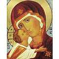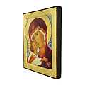 Icona da parete, di forma rettangolare, che raffigura la Vergine della Tenerezza di Vladimir (altrimenti detta "Theotókos di Vladimir"). Si tratta di una copia d'arte bizantina: l'icona originale della Madre di Dio della Tenerezza, a cui questa riproduzione si ispira, fu dipinta a Costantinopoli nel XII secolo ed è conservata a Mosca. Tra le icone ortodosse più venerate al mondo, la Theotókos ("Madre di Dio" in greco) è la figura protettrice della Russia. L'immagine è una fine litografia incollata su legno e rifinita con foglia d'oro, mentre le aureole, le scritte e i bordi sono realizzati a mano. Il bordo del quadretto è in rilievo con smussatura. Il gancio sul retro consente di appendere l'icona al muro. La Madonna di Vladimir indossa un velo rosso scuro e i volti dei soggetti presentano sfumature molto fini e curate. Anche la resa dei ricci del Gesù Bambino denota un'attenzione ai dettagli molto alta. Il figlio abbraccia la madre e i volti sono accostati; tale rappresentazione, classico esempio di iconografia bizantina della tipologia eleusa, crea un'immagine molto dolce. Lo sfondo, di color oro brillante, dona ulteriore risalto ai soggetti della rappresentazione. Il certificato sul retro attesta le caratteristiche di questa icona, realizzata in Grecia.
