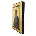 Icona da parete, di forma rettangolare, che raffigura la Vergine della Tenerezza di Vladimir. Si tratta di una copia d'arte bizantina: l'icona originale della Madre di Dio della Tenerezza, a cui questa riproduzione si ispira, fu dipinta a Costantinopoli nel XII secolo ed è conservata a Mosca. Tra le icone ortodosse più venerate al mondo, la Theotókos ("Madre di Dio" in greco) è la figura protettrice della Russia. L'immagine è una fine litografia di una Madonna con Bambino, incollata su legno e rifinita con foglia d'oro, mentre le aureole, le scritte e i bordi sono realizzati a mano. Il contorno interno, incassato, divide la rappresentazione centrale dal bordo esterno, facendo sembrare quest'ultimo una cornice. Il gancio sul retro consente di appendere l'icona al muro. La Madonna di Vladimir indossa un indumento scuro e i volti dei soggetti presentano sfumature molto fini e curate. Anche la resa dei ricci del Gesù Bambino denota un'attenzione ai dettagli molto alta. Il figlio abbraccia la madre e i volti sono accostati; tale rappresentazione, classico esempio di iconografia bizantina della tipologia eleusa, crea un'immagine molto dolce. Lo sfondo, di color oro brillante, dona ulteriore risalto ai soggetti della rappresentazione. Il certificato sul retro attesta le caratteristiche di questa icona, realizzata in Grecia. Dimensioni: 18 cm (L), 24 cm (A), 2,3 cm (P). Peso: 476 gr.