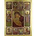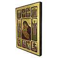 Questa grande icona da parete di legno presenta 11 immagini diverse che raffigurano la Madonna di Vladimir, gli Arcangeli e una serie di episodi biblici che riguardano la Vergine Maria e il Signore. Il quadretto-icona è realizzato con litografie su carta incollate ad una tavola lignea, rifinite con numerose scritte, aureole e bordi bordeaux tracciati a mano. Lo sfondo è abbellito da una rifinitura in foglia d'oro che renderà questa tavoletta illustrata alta ben 40 cm ancora più bella e lucente. Un leggero effetto dona un aspetto anticato allo sfondo dell'icona. I colori predominanti, l'oro e il porpora, sono tipici dell'arte greco-bizantina e conferiscono luminosità e bellezza al quadretto. Al centro trova posto la Vergine della Tenerezza di Vladimir, una riproduzione della famosa Madonna con Bambino dipinta a Costantinopoli nel XII secolo. La Madre di Dio della Tenerezza è tra le icone ortodosse più venerate al mondo ed è la figura protettrice della Russia. Il figlio abbraccia la madre e i volti sono accostati; tale rappresentazione, classico esempio di iconografia bizantina della tipologia eleousa, crea un'immagine molto dolce. La serie di episodi biblici includono l'Annunciazione, l'Ascensione, la Dormizione (Assunzione di Maria), S. Giorgio che uccide il drago col cavallo bianco, la Trasfigurazione e S. Demetrio che, in sella a un cavallo rossastro, uccide un moro. Le litografie a lato rappresentano, invece, gli Arcangeli Michele e Gabriele. Il gancio posteriore consente di appendere il quadretto al muro. Un certificato sul retro attesta le caratteristiche pregiate e il processo di realizzazione di questa opera artigianale greca. Altezza: 40 cm, larghezza: 30 cm, spessore: 2,8 cm.