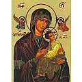 Icona da parete, di forma rettangolare, che raffigura la Madre del Perpetuo Soccorso. Si tratta di una copia dell'icona realizzata dall'iconografa Lia Galdiolo, a sua volta ispiratasi all'opera originale della Madonna del Perpetuo Soccorso, forse dell'iconografo cretese Andrea Rizo da Candia. Rientra nel gruppo di rappresentazioni mariane "Madre di Dio della Passione" (Amolyntos). L'immagine è una fine litografia incollata su legno e rifinita con foglia d'oro, mentre le aureole, le scritte e i bordi sono realizzati a mano. Il bordo interno del quadretto, incassato, divide la scena centrale dal bordo esterno, che diventa una cornice. Il gancio sul retro consente di appendere l'icona al muro. La Madre del Perpetuo Soccorso è a mezza figura e ha in braccio il Bambino, a cui porge la mano destra. Ai lati del capo si leggono le lettere greche MP ΘΥ (Madre di Dio), insieme all'arcangelo Michele che porta un vaso con una lancia. A sinistra, invece, trova posto l'arcangelo Gabriele con la croce e dei chiodi. Il Bambino, che guarda quanto portato da Gabriele, ha di fianco a sè una scritta che lo identifica (IC-XC) e si tiene saldo alla mano della Madre con entrambe le mani, quasi a cercare il suo aiuto. Il sandalo del piccolo è raffigurato slacciato. Lo sfondo, di color oro brillante, dona ulteriore risalto ai soggetti della rappresentazione. Il certificato sul retro attesta le caratteristiche di questa icona, realizzata in Grecia. Dimensioni: 11,5 cm (L), 14 cm (A), 2 cm (P). Peso: 145 gr.