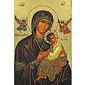 Icona da parete, di forma rettangolare, che raffigura la Madre del Perpetuo Soccorso. Si tratta di una copia dell'icona realizzata dall'iconografa Lia Galdiolo, a sua volta ispiratasi all'opera originale della Madonna del Perpetuo Soccorso, forse dell'iconografo cretese Andrea Rizo da Candia. Rientra nel gruppo di rappresentazioni mariane "Madre di Dio della Passione" (Amolyntos). L'immagine è una fine litografia incollata su legno e rifinita con foglia d'oro, mentre le aureole, le scritte e i bordi sono realizzati a mano. Il bordo interno del quadretto, incassato, divide la scena centrale dal bordo esterno, che diventa una cornice. Il gancio sul retro consente di appendere l'icona al muro. La Madre del Perpetuo Soccorso è a mezza figura e ha in braccio il Bambino, a cui porge la mano destra. Ai lati del capo si leggono le lettere greche MP ΘΥ (Madre di Dio), insieme all'arcangelo Michele che porta un vaso con una lancia. A sinistra, invece, trova posto l'arcangelo Gabriele con la croce e dei chiodi. Il Bambino, che guarda quanto portato da Gabriele, ha di fianco a sè una scritta che lo identifica (IC-XC) e si tiene saldo alla mano della Madre con entrambe le mani, quasi a cercare il suo aiuto. Il sandalo del piccolo è raffigurato slacciato. Lo sfondo, di color oro brillante, dona ulteriore risalto ai soggetti della rappresentazione. Il certificato sul retro attesta le caratteristiche di questa icona, realizzata in Grecia. Dimensioni: 17,5 cm (L), 23,5 cm (A), 2,3 cm (P). Peso: 543 gr.