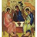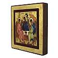 Icona da parete, di forma quasi quadrata, che raffigura la Trinità di Andrej Rublëv, dall'interpretazione incerta. Viene ricreata la visita di tre angeli ad Abramo, in cui gli fu fatta la promessa di una discendenza. Considerata "l'icona delle icone", è anche chiamata "Ospitalità di Abramo" ed è stata realizzata nel XV secolo. Molti studiosi interpretano le tre figure come la Trinità: a sinistra della rappresentazione ci sarebbe Dio Padre, Gesù sarebbe al centro e sulla destra viene identificato lo Spirito Santo. Nella figura è presente la coppa, metafora del sacrificio del Signore. L'immagine è una fine litografia incollata su legno e rifinita con foglia d'oro, mentre le aureole, le scritte e i bordi sono realizzati a mano. Il contorno interno, incassato, divide la rappresentazione centrale dal bordo esterno, facendo sembrare quest'ultimo una cornice. Il gancio sul retro consente di appendere l'icona al muro. Il certificato sul retro attesta le caratteristiche di questa icona, realizzata in Grecia. Dimensioni: 13,5 cm (L), 14,3 cm (A), 2,2 cm (P). Peso: 245 gr.