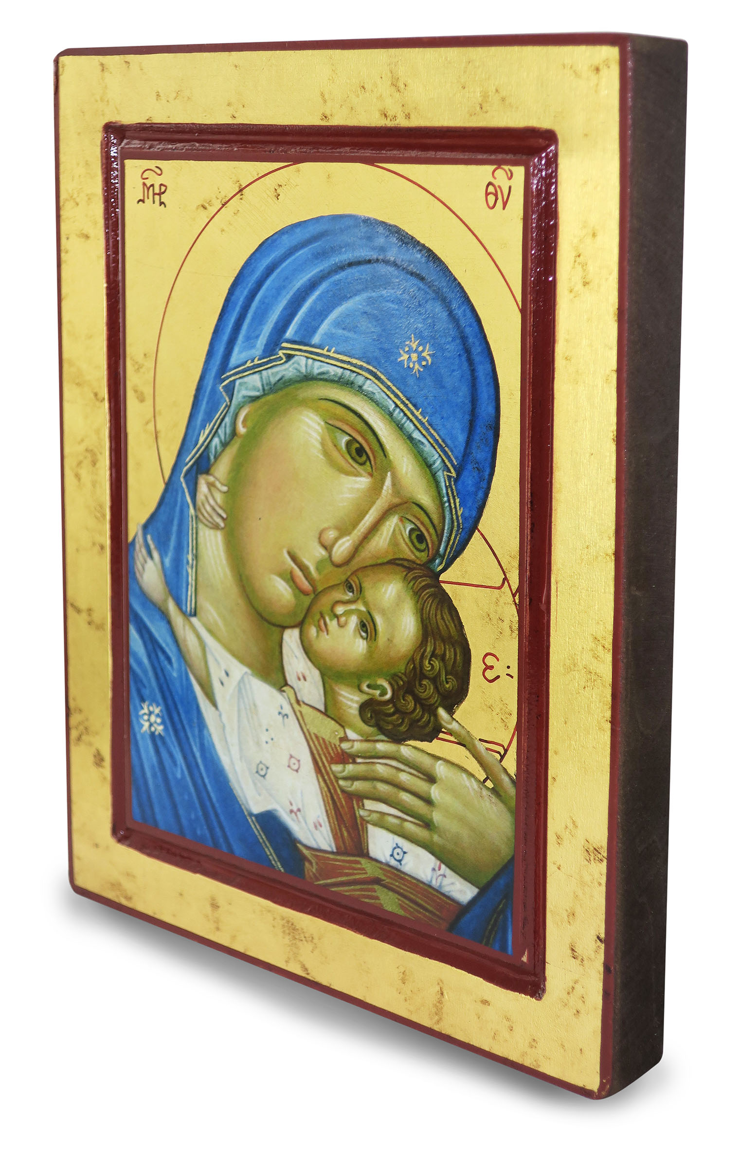 Icona da parete, di forma rettangolare, che raffigura il dettaglio del Volto della Vergine della Tenerezza. L'immagine è una fine litografia di una Madonna con Bambino, incollata su legno e rifinita con foglia d'oro, mentre le aureole, le scritte e i bordi sono realizzati a mano. Il contorno interno, incassato, divide la rappresentazione centrale dal bordo esterno, facendo sembrare quest'ultimo una cornice. Il gancio sul retro consente di appendere l'icona al muro. La Madonna indossa un copricapo azzurro, mentre le vesti del Bambino sono arancioni e bianche. I volti dei soggetti presentano sfumature molto fini e curate, e anche la resa dei ricci del Gesù Bambino denota un'attenzione ai dettagli molto alta. Il figlio abbraccia la madre e i volti sono accostati; tale rappresentazione, classico esempio di iconografia bizantina della tipologia eleousa, crea un'immagine molto dolce. Lo sfondo, di color oro brillante, dona ulteriore risalto ai soggetti della rappresentazione. Il certificato sul retro attesta le caratteristiche di questa icona, realizzata in Grecia. Dimensioni: 19 cm (L), 24 cm (A), 2,3 cm (P). Peso: 545 gr.