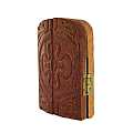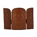 Piccolo trittico greco della Madonna di Vladimir, in legno dalle tonalità calde rossastre, con retro intagliato e cerniere metalliche che ne consentono l'apertura. Il pannello centrale ospita la Vergine di Vladimir, mentre sui laterali viene rappresentata l'Annunciazione, con l'Arcangelo sulla sinistra e la Vergine Maria sulla destra. La Madonna di Vladimir indossa un velo rosso scuro e i volti dei soggetti presentano sfumature molto fini e curate. Anche la resa dei ricci del Gesù Bambino denota un'attenzione ai dettagli molto alta. Il figlio abbraccia la madre e i volti sono accostati; tale rappresentazione, classico esempio di iconografia bizantina della tipologia eleusa, crea un'immagine molto dolce. Lo sfondo, di color oro brillante, dona ulteriore risalto ai soggetti della rappresentazione. L'icona originale della Madre di Dio della Tenerezza, a cui questa riproduzione si ispira, fu dipinta a Costantinopoli nel XII secolo ed è conservata a Mosca. Tra le icone ortodosse più venerate al mondo, la Theotókos ("Madre di Dio" in greco) è la figura protettrice della Russia. Le immagini, che richiamano lo stile delle icone bizantine, sono una stampa a colori su carta lucida applicata su legno. I colori predominanti sono il rosso scuro e il color oro. Questo trittico, dalla forma arrotondata nella parte superiore, può essere un'idea regalo per occasioni come cresime, comunioni, matrimoni, anniversari, ecc. A seconda della disponibilità, il motivo dell'intaglio esterno e le immagini all'interno potrebbero differire rispetto a quanto indicato in foto. Misure del trittico aperto: Altezza 7 cm / Larghezza 9,8 cm. Realizzato in Grecia.