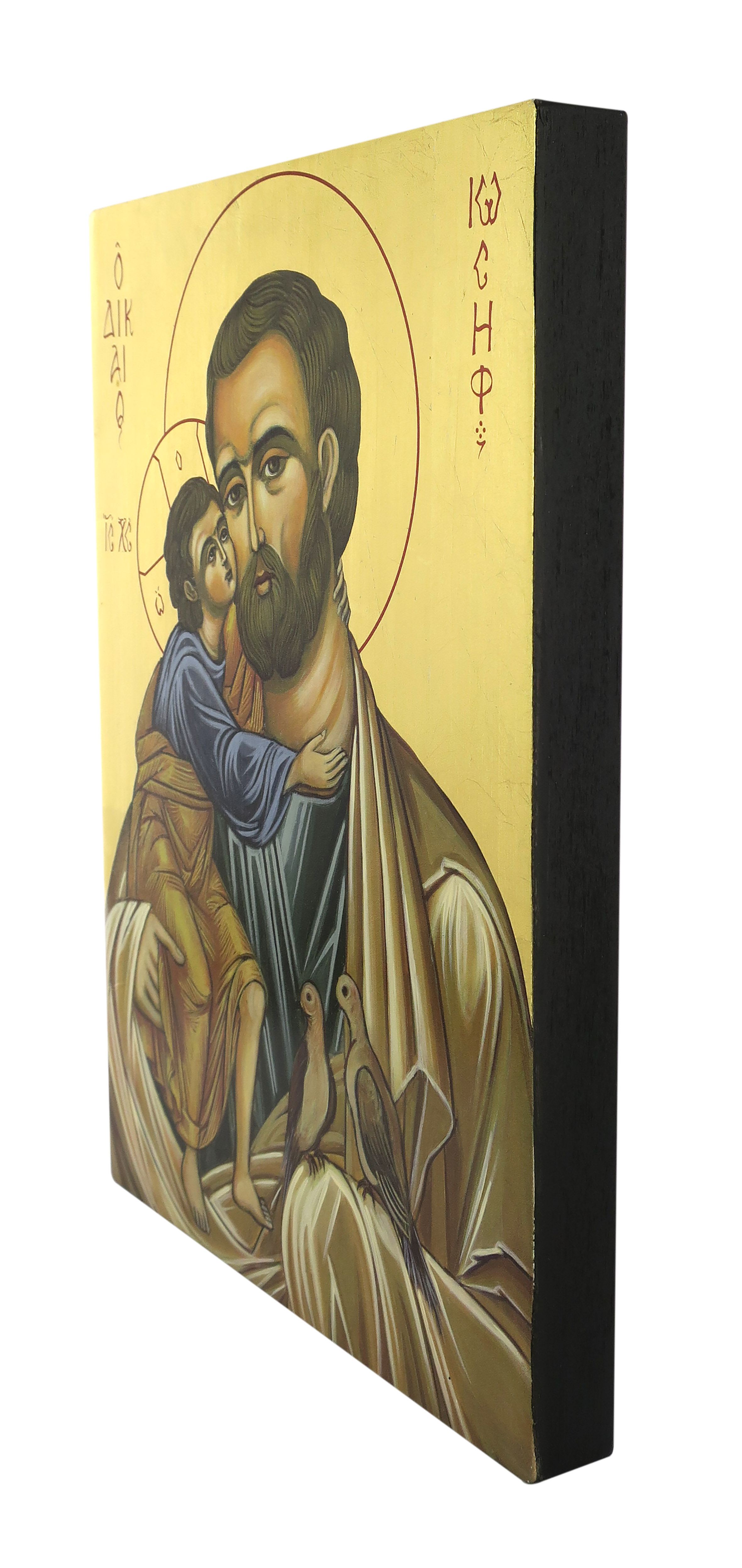 Icona raffigurante il San Giuseppe dipinta a mano su legno con fondo oro cm 19x26.Icone dipinte da Liviu Balac (pittore di icone da oltre 30 anni), con tecniche bizantine del XII-esimo secolo.L'icona verrà consegnata con certificato di garanzia del pittore e inscatolata in una confezione regalo.Il legno utilizzato per l'icona stessa è abete, con umidità del 10/11% circa.L'icona è prodotta totalmente in Romania.