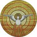 Questa croce raffigura: la discesa dello Spirito Santo su Maria, gli apostoli radunati nel Cenacolo, l'annunciazione, la trinità e la deposizione di Gesù. Al centro c'è la Colomba che discende su Maria.Questa immagine è una stampa su legno.Realizzato in Italia.