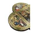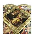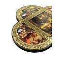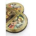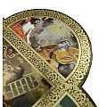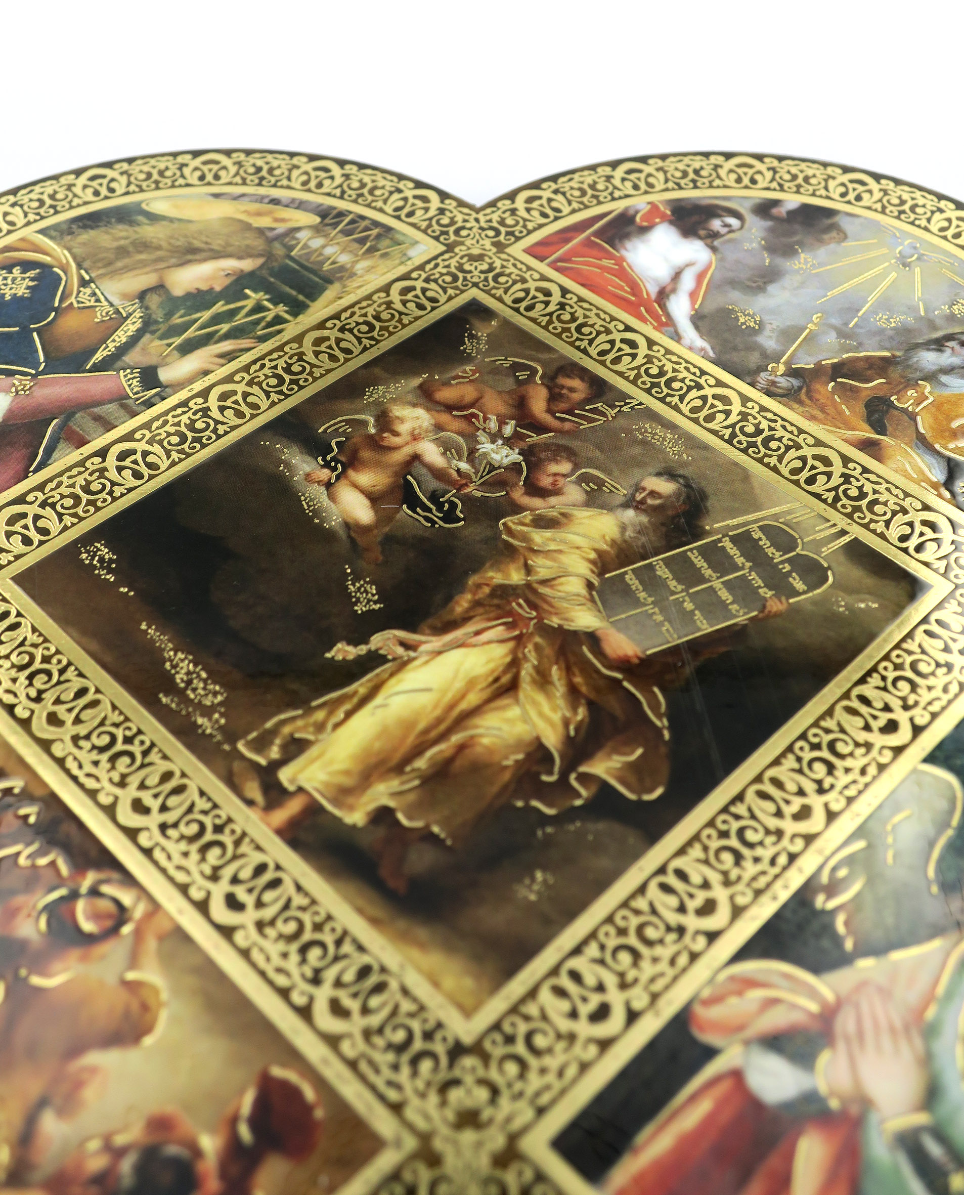 Croce in legno MDF con le 4 estremità arrotondate a semicerchio volte a delineare la forma caratteristica della Cristianità. La tavoletta a forma di croce è suddivisa in settori contornati da un intreccio decorativo color oro raffiguranti scene relative ai 10 comandamenti riportate sulle famose tavole date da Yahweh a Mosè sul monte Sinai. Le rappresentazioni sono stampe a colori (tra cui il color oro) su carta, poi applicate alla croce-icona in MDF. La parte quadrata centrale, più grande, mostra le tavole sacre, mentre nelle altre i soggetti sono rivolti con lo sguardo al quadro centrale, in posizione di reverenza e rispetto nei confronti delle tavole dei comandamenti. I colori pacati e tenui usati infondono tranquillità e serenità. Grazie al comodo gancetto posteriore, è possibile appendere questa tavoletta illustrata in MDF a forma di croce senza che si veda il chiodino o il gancetto stesso. Prodotta in Italia. Peso: 160 gr (197 gr con scatola). Dimensioni: 18,5 cm (L e A), 1,2 cm (P). Confezione: 19 cm (L e A), 1,5 cm (P).