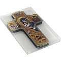 Croce icona raffigurante la Madonna della Tenerezza di Vladimir.L'immagine è una stampa di carta lucida applicata su croce in legno, con finiture a caldo in color oro e color argento. La croce può essere appesa grazie al gancio sul retro.Materiale: legno MDF. Dimensioni: 12 x 18 cm. Verrà consegnato in una scatola trasparente.Realizzato artigianalmente in Italia.