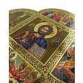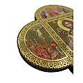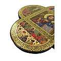 Croce in legno MDF con le 4 estremità arrotondate a semicerchio volte a delineare la forma caratteristica della Cristianità. La tavoletta a forma di croce è suddivisa in settori contornati da un intreccio decorativo color oro raffiguranti scene relative alla vita di Cristo. Le rappresentazioni sono stampe a colori (tra cui il color oro) su carta, poi applicate alla croce-icona in MDF. La parte quadrata centrale, più grande, mostra la figura del Signore con un'aureola color oro intorno al volto, un libro e la mano benedicente. Le altre scene laterali, invece, si riferiscono al Ritrovamento di Gesù al Tempio, all'Ultima Cena, alla Crocifissione e alla Resurrezione. Da notare che l'ordine cronologico delle scene proposte sulla tavoletta coincide con quello che si segue quando ci si fa il segno della croce. I colori pacati e tenui usati in questa opera infondono tranquillità e serenità. Grazie al comodo gancetto posteriore, è possibile appendere questa tavoletta MDF illustrata a forma di croce senza che si veda il chiodino o il gancetto stesso. Prodotta in Italia. Peso: 157 gr (197 gr con scatola).Dimensioni: 18,5 cm (L e A), 1,2 cm (P). Confezione: 19 cm (L e A), 1,5 cm (P).