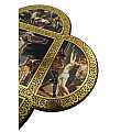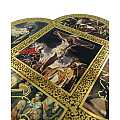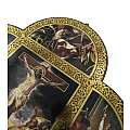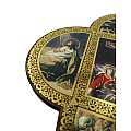 Croce in legno MDF con le 4 estremità arrotondate a semicerchio volte a delineare la forma caratteristica della Cristianità. La tavoletta a forma di croce è suddivisa in settori contornati da un intreccio decorativo color oro in cui sono raffigurate scene relative ai Misteri del Dolore. Le rappresentazioni sono stampe a colori (tra cui il color oro) su carta, poi applicate alla croce-icona in MDF. Le rappresentazioni riguardano i seguenti episodi dolorosi della vita del Salvatore: l'Agonia di Gesù nel Getsemani (Mt 26, 36-39), la Flagellazione di Gesù (Gv 19,1-3), l'Incoronazione di spine (Mt 27, 27-29), il Viaggio al Calvario di Gesù (Mc 15, 21-22) e Gesù crocifisso che muore in croce (Lc 23, 33-46). Grazie al comodo gancetto posteriore, è possibile appendere questa tavoletta illustrata in MDF a forma di croce senza che si veda il chiodino o il gancetto stesso. Prodotta in Italia. Peso: 157 gr (197 gr con scatola). Dimensioni: 18,5 cm (L e A), 1,2 cm (P). Confezione: 19 cm (L e A), 1,5 cm (P).