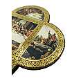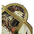 Croce in legno MDF con le 4 estremità arrotondate a semicerchio volte a delineare la forma caratteristica della Cristianità. La tavoletta a forma di croce è suddivisa in settori contornati da un intreccio decorativo color oro in cui sono raffigurate scene relative ai Misteri della Luce. Le rappresentazioni sono stampe a colori (tra cui il color oro) su carta, poi applicate alla croce-icona in MDF. La parte quadrata centrale, più grande, mostra l'istituzione dell'Eucarestia (Luca 22, 199): il Salvatore alza la particola sopra la tavola dove siedono gli Apostoli, dichiarando che quello è il Corpo di Cristo. Le scene laterali, invece, raffigurano il Battesimo di Gesù al Giordano (Marco 1, 9-11), le nozze di Canaan (descritto nel vangelo di Giovanni), l'Annuncio del regno di Dio (Marco 1, 14-15) e la Trasfigurazione di Gesù (Matteo 17). Nelle rappresentazioni spicca il contrasto tra le aree più scure e i colori più chiari (es. della tavola o della luce emanata dalla figura del Signore). Grazie al comodo gancetto posteriore, è possibile appendere questa tavoletta illustrata in MDF a forma di croce senza che si veda il chiodino o il gancetto stesso. Prodotta in Italia. Peso: 160 gr (197 gr con scatola). Dimensioni: 18,5 cm (L e A), 1,2 cm (P). Confezione: 19 cm (L e A), 1,5 cm (P).