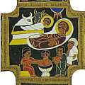 Croce raffigurante la Natività in stile bizantino.L'imagine è una stampa su legno rifinita con foglia d'oro.Il gancio/foro sul retro da la possibilità di essere appesa a muro.Realizzato artigianalmente in Italia.