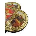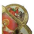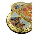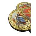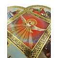 Croce in legno MDF con le 4 estremità arrotondate a semicerchio volte a delineare la forma caratteristica della Cristianità. La tavoletta a forma di croce è suddivisa in settori contornati da un intreccio decorativo color oro in cui sono raffigurati i quattro Evangelisti intendi a narrare la vita del Signore. Le rappresentazioni sono stampe a colori (tra cui il color oro) su carta, poi applicate alla croce-icona in MDF. La parte quadrata centrale, più grande, mostra una colomba con aureola, con raggi che si propagano sullo sfondo di un forte rosso. A contorno, sono rappresentati i quattro Evangelisti con le loro simbologie: Marco con il leone, Luca con il bue, Giovanni con l'aquila e Matteo con l'uomo alato (o angelo). Ad attirare l'attenzione dello spettatore è il contrasto cromatico tra il quadro centrale e i delicati colori delle 4 rappresentazioni a semicerchio. Grazie al comodo gancetto posteriore, è possibile appendere questa tavoletta illustrata in MDF a forma di croce senza che si veda il chiodino o il gancetto stesso. Peso: 160 gr (197 gr con scatola). Dimensioni: 18,5 cm (L e A), 1,2 cm (P). Confezione: 19 cm (L e A), 1,5 cm (P).
