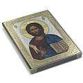 Icona raffigurante il Cristo Pantocratore con il libro aperto. L'immagine è una stampa di carta lucida su legno ovale, con finiture a caldo in oro e in argento. La tavola può essere appesa grazie al gancio che c'è sul retro.Materiale: legno mdf. Dimensioni: 10 x 14 cm. Verrà consegnato in una scatola trasparente.Realizzato artigianalmente in Italia.