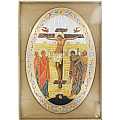 Icona raffigurante la Crocefissione di Cristo. L'immagine è una stampa di carta lucida su legno ovale, con finiture a caldo in oro e in argento. La tavola può essere appesa grazie al gancio/foro che c'è sul retro.Materiale: legno mdf. Dimensioni: 20x30 cm. Verrà consegnato in una scatola trasparente.Realizzato artigianalmente in Italia.